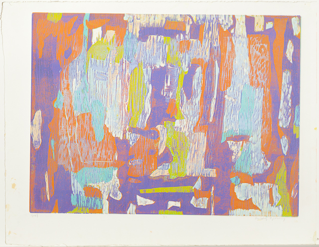 The artist shaped the abstracted image with the block reduction technique, which Pablo Picasso popularized in the early 1960s. “I think Picasso wanted that same energy and immediacy when he made his bullfight prints,” Sperry says. Working on a single piece of Shina (Japanese plywood), Sperry successively carved off areas of the block, while inking and printing each resulting shape in a different color on a sheet of paper. A final multicolor impression—in this case, a single print—emerged as a result of the artist’s search for a nonrepresentational translation of her reflective observations and studies of nature.